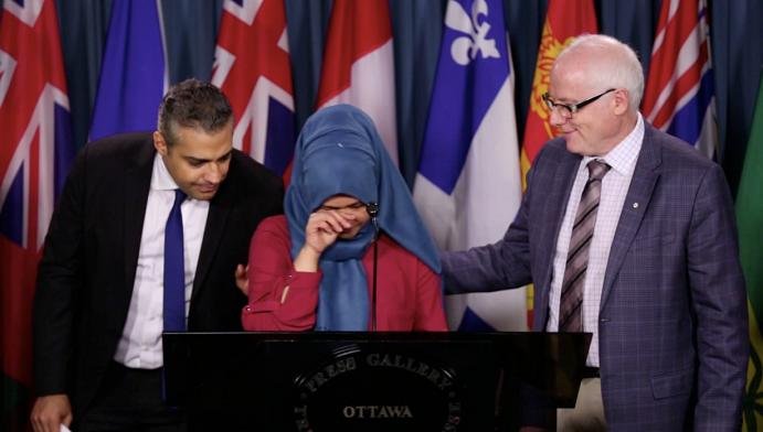Kamila Telendibaeva speaks in support of her husband’s release with journalist Mohamed Fahmy and then Secretary General of Amnesty Canada Alex Neve during announcement of the Protection Charter in Ottawa on Jan. 26, 2016